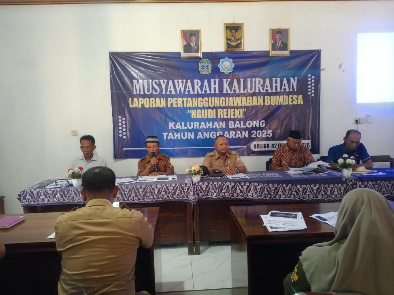 Kalurahan Balong, Hari/Tanggal Senin 02 Februari 2025 (musyawarah tahunan) Waktu : 10.00 Wib s/d selesai Musyawarah Kalurahan Laporan Pertanggungjawaban Bumdesa Ngudi Rejeki Kalurahan Balong Tahun 2025, tempat Balai Kalurahan Balong Peserta yang hadir Kapanewon Girisubo Lurah, perangkat Kalurahan, Bamuskal, pengurus BUMDes Ngudi Rejeki, tokoh masyarakat, perwakilan pemuda dan perempuan.